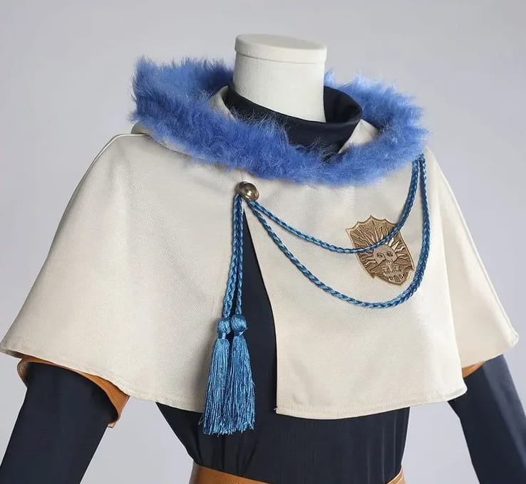 Beżowa peleryna z niebieskim futerkiem i broszką gildii